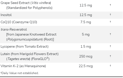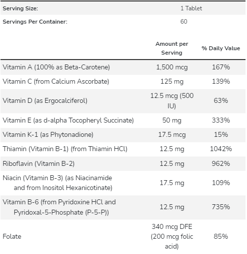 Egyéb összetevők: mikrokristályos cellulóz, sztearinsav (növényi forrás), kroszkarmellóz-nátrium, szilícium-dioxid és vegetáriánus bevonat. E-vitamin nem GMO szójából.