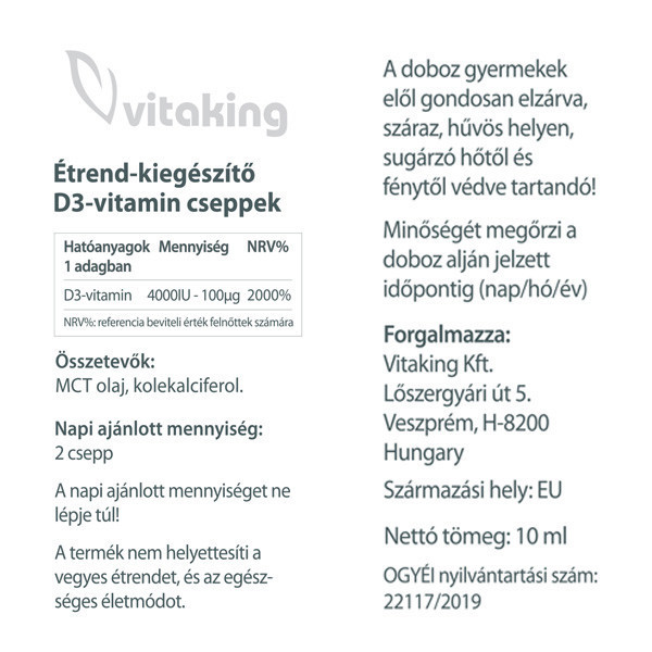 A D-vitamin (D3 vitamin) zsírban oldódik. A Vitaking D vitamin csepp már eleve olajban oldva tartalmazza a hatóanyagot. Nagyvárosokban, ahol sűrű a szmog, emelni kell a D-vitamin bevitelt. Alapvető feladata a vér kalcium- és foszforszintjének szabályozása, a csontok erősítése és az egészséges fogazat fenntartása.