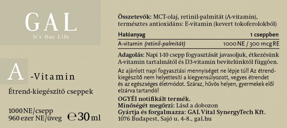 Sima, mezei retinol-palmitát MCT-olajban oldva, némi természetes E-vitamin-komplexszel stabilizálva.