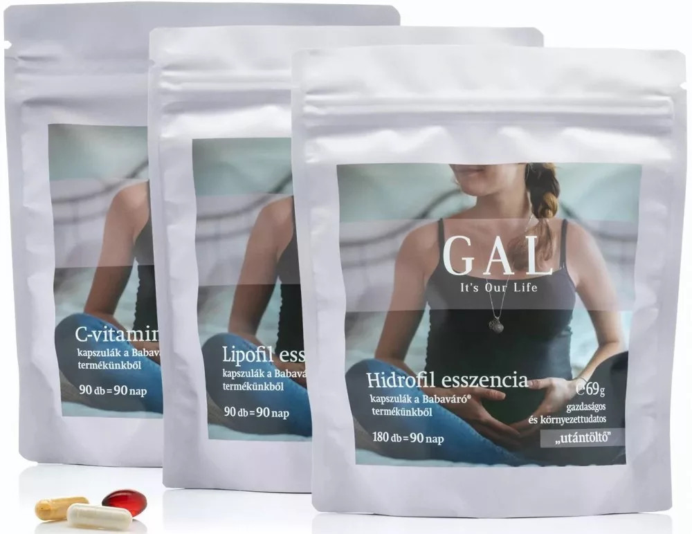 Ez a termékünk a GAL Babaváró® 90 adagos változata, a három "utántöltő" együtt.