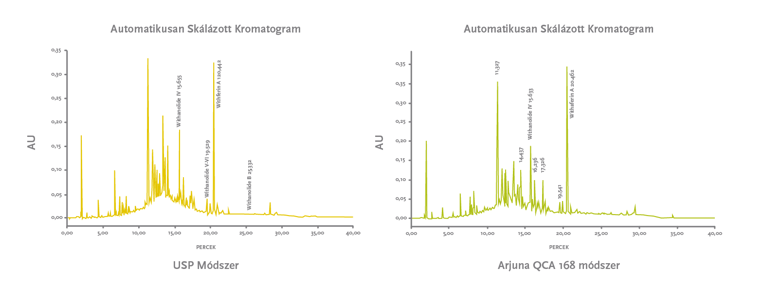 Nemrégen egy ún. kromatográfiai vizsgálat eredményeire lettünk figyelmesek, ahol összehasonlították a KSM-66®, a Sensoril® és a Shoden® ashwagandha-kivonatokat. A vizsgálat eredménye visszaigazolta egyrészt, amit eddig is tudtunk: a Sensoril® lényegesen szélesebb hatóanyagspektrummal rendelkezik, mint a KSM-66®. (A Sensoril® ún. HPLC-kromatogramján sokkal több csúcs látszódott. Minden csúcs egy hatóanyagot jelent). Amin viszont meglepődtünk, hogy a Shoden® HPLC-kromatogramján még a Sensoril®-éhoz képest is sokkal több csúcs szerepelt, azaz még annál is lényegesen szélesebb hatóanyagspektrumú, avagy a botanikai ujjlenyomat tökéletes megőrzésre került.
