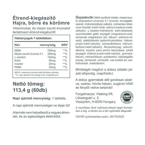 Speciálisan a szép és egészséges haj, bőr, köröm megtartására, illetve az ezeken a területeken kialakuló problémák kezelésére szolgáló készítmény.A tabletta hatóanyagai kedvező hatást fejtenek ki a bőr állapotára, a haj minőségére és a körmök szilárdságára.A Swanson Haj, bőr, Köröm komplex nagy mennyiségben tartalmaz MSM-et, mezei zsurlót, kolnt, inozitolt és PABA-t (B-10 vitamint). Szedését a normál multivitamin adagján felül javasolják.OÉTI bejegyzési szám: 4463/2009 Napi ajánlott mennyiség: 1 tablettaA felhasználási javaslatban megadott mennyiséget ne lépje túl! A termék nem helyettesíti a vegyes étrendet és az egészséges életmódot. A doboz gyermekek elől gondosan elzárva tartandó!Összetevők Mennyiség/napi adag RDA %MSM (methyl-sulfonyl-methane) 700 mg **Mezei zsurló 250 mg **Ebből 8% kovasav 20 mg **L-Cysteine 100 mg **Kolin 50 mg **Inositol 25 mg **PABA 25 mg **RDA*: felnőttek számára javasolt napi bevitel