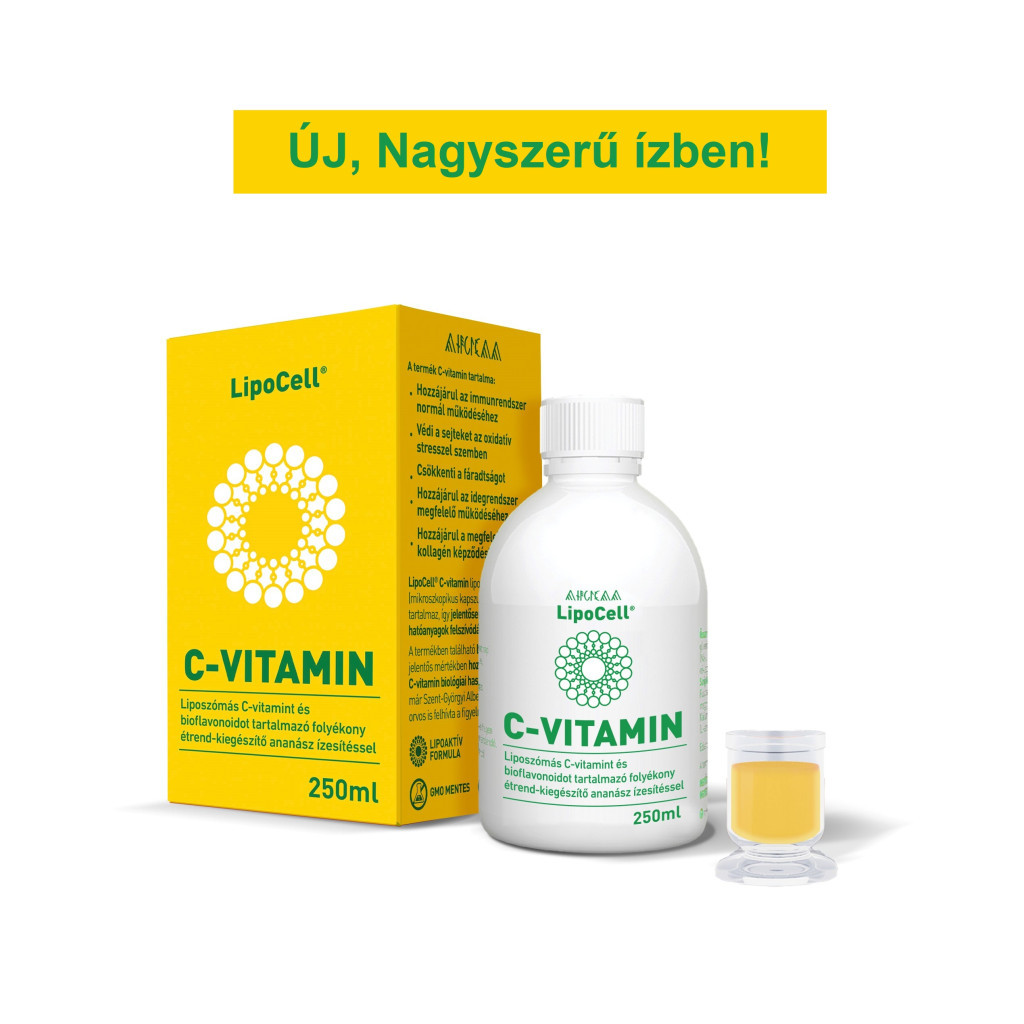 LipoCell liposzómás C-vitamin, bioflavonoid tartalmú folyékony étrend-kiegészítő ananászos ízben. GMO- és cukormentes, vegán termék.