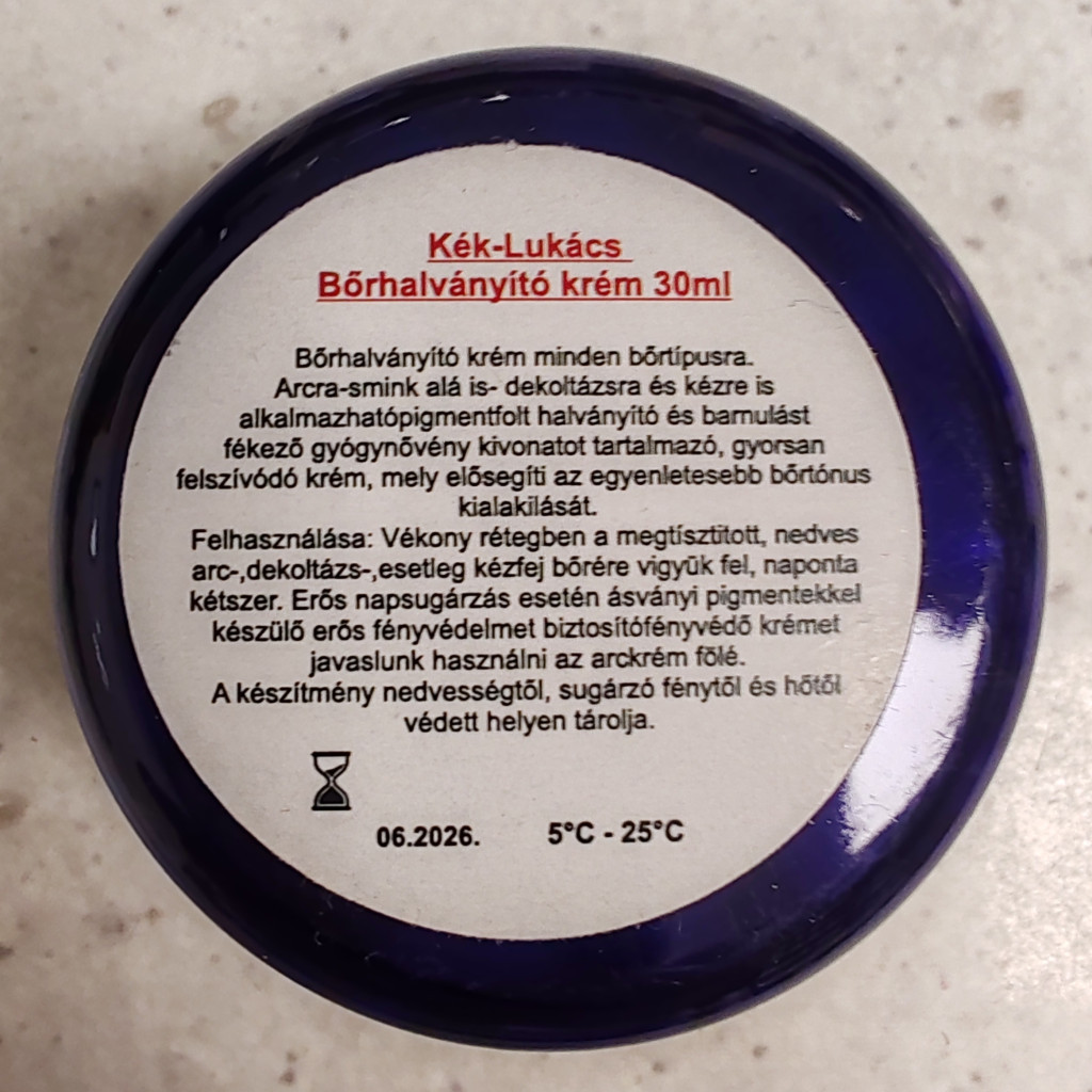 A Kék-Lukács Bőrhalványító krém minden bőrtípusra ajánlott. Gyógynövény-kivonatot tartalmazó, könnyen felszívódó formula, amely segíthet a bőr ápolt, harmonikus megjelenésének fenntartásában. Rendszeres használata támogatja az egységesebb bőrtónus láthatóságát, és hozzájárulhat a pigmentfoltok, terhességi foltok kevésbé feltűnő megjelenéséhez.