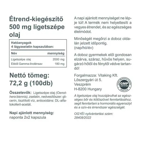 A ligetszépe olaj hozzájárulhat az egészséges bőr és kötőszövet fenntartásához, segít fenntartani a hormonális egyensúlyt és a szív és érrendszer egészségét. Ez a Vitaking készítmény napi adagonként (4 kapszula) 2000mg ligetszépe olajat tartalmaz, melyből Gamma-linolénsav 180mg.