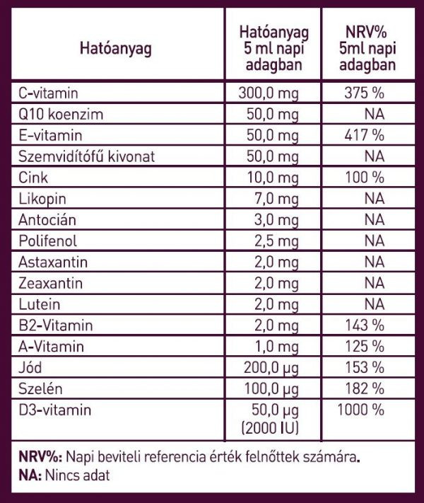 ÖSSZETEVŐK: Tisztított víz, Növényi glicerin; Vitamin: C-vitamin (Na-L-aszkorbát); Savanyúságot szabályzó anyag; Emulgeálószer: szója lecitin; Paradicsom kivonat (10% likopin); Q10 koenzim; Vitamin: E-vitamin (d-alpha-tocopherol); Fekete áfonya kivonat (5 % antocián); Szemvidítófű kivonat; Körömvirág kivonat (5% zeaxanthin); Vörös alga kivonat (5 % astaxantin); Körömvirág kivonat (5% Lutein); Cink (cink-bisz-glicinát); Emulgeáló anyag: poliszorbát; Vitamin: A-vitamin (B-karotin); Bodzabogyó kivonat (25% polifenol, 5 % antocián); Aroma: kékszőlő aroma; ; Vitamin: B2-vitamin (riboflavin); Vitamin: D3-vitamin; Jód (kálium-jodid); Szelén (nátrium-szelenit).