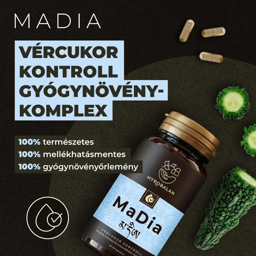 A MaDia gyógynövény-komplex a benne található gyógynövényeknek köszönhetően, mint pl. a gurmar, a keserű dinnye, a fahéj, a görögszéna, a moringa és a fekete mag