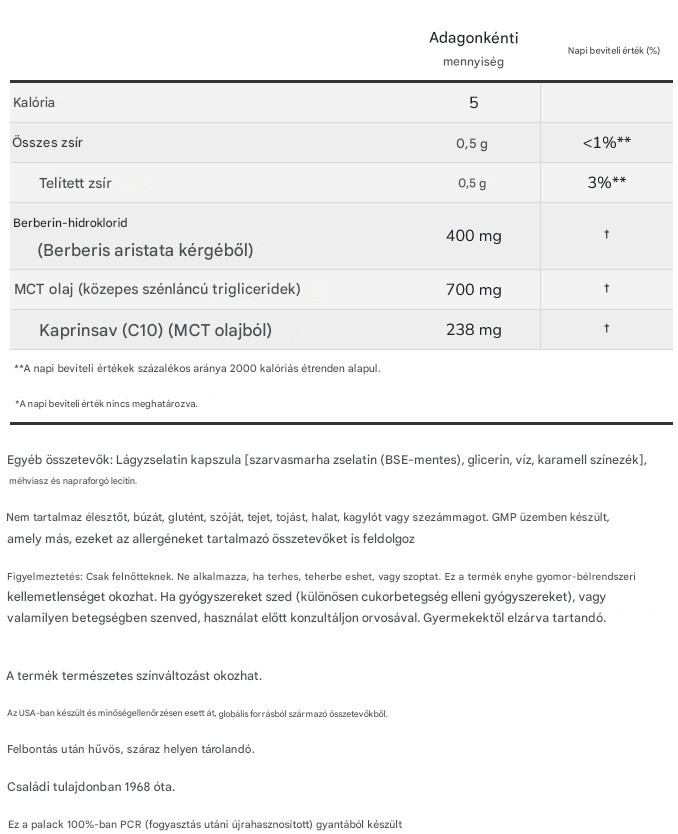 Berberine HCL 400mg, MCT olaj 700mg, Kaprinsav (C10) (MCT olajból) 238mg