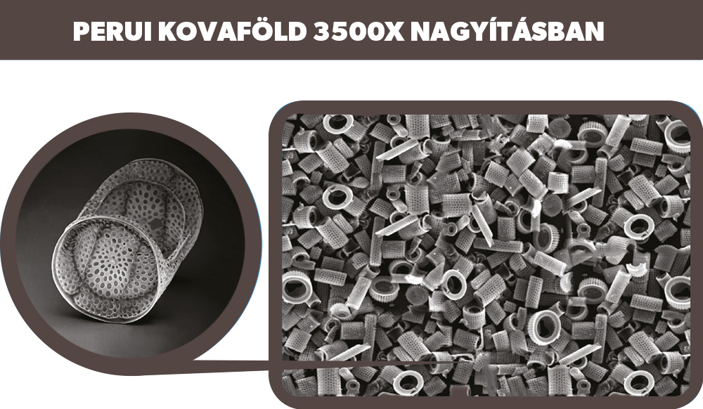 Tisztító és méregtelenítő hatékonysága miatt kiemelkedő termék a piacon. Megtisztítja a beleket, az ereket, a nyirokkeringést és a bőrt. A Perui kovaföld nem csodaszer! Az emberi szervezet a csoda, mely képes megújulni, ha tisztán, rendeltetésszerűen működik. Mindemellett koncentrált mennyiségben tartalmazza szervezetünk egyik fontos tápanyagát, a szilícium-dioxidot. A Perui kovaföld az egyik legtisztább (94%) minőségű étkezési kovaföld. A Perui kovaföld képes hatékonyan kivezetni a baktériumokat, vírusokat és nehézfémeket a szervezetből, pusztán a szerkezetéből adódóan.