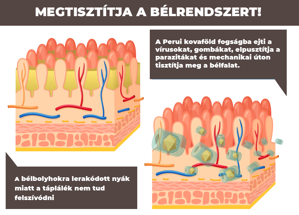 Egyetlen gramm Perui kovaföld 300 m2 bélfelületről képes felszívni és kivezetni a gyulladásos folyadékot, miközben a természetes bélflórát erősíti. Az apró hengerek erős negatív töltésükkel vonzzák és elnyelik a baktériumokat, gombákat, vírusokat, endotoxinokat, gyógyszer- és növényvédőszer-maradványokat, drogokat, nehézfémeket. Csapdába esnek a hengerekben és kiürülnek a szervezetből. A férgek, paraziták megsérülnek az éles élek által és elpusztulnak. A termék fogyasztói gyakran jelzik: ”Jobban érzem magam!”. Ez a jobb közérzet abból adódik, hogy minden káros lerakódás eltávolításra kerül a bélrendszerből. A tiszta emésztőrendszer sokkal hatékonyabban dolgozik, jóval több energiához jutunk és így az immunrendszer is hatékonyabbá válik.