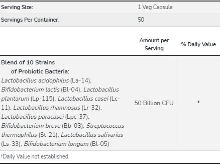 Ez a termék úgy lett megtervezve, hogy a Best By dátumig 50 milliárd CFU hatékonyságot biztosítson. A NOW® Probiotic-10 ™ az élő szervezetek kiegyensúlyozott spektrumát kínálja saválló rezisztens probiotikus baktériumtörzsekből, amelyekről ismert, hogy természetes módon képesek megtelepedni az emberi GI traktusban. * A probiotikus baktériumok kulcsfontosságúak az egészséges emésztés szempontjából, segítenek fenntartani a bél integritását, támogatja a megfelelő bélmozgást és részt vesz a méregtelenítési folyamatban. * A Probiotic-10 ™ olyan baktériumtörzseket használ fel, amelyeket klinikailag validáltak az immunrendszer egészséges működésének támogatására. *