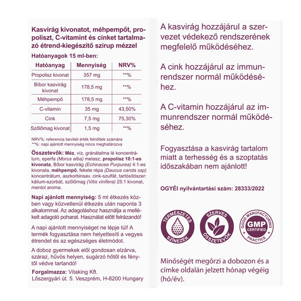 A Vitaking Propolisz szirup kasvirág kivonatot, méhpempőt, propoliszt, C-vitamint és cinket tartalmazó folyékony étrend-kiegészítő mézzel édesítve. 100% alkoholmentes, ezért gyerekeknek és felnőtteknek is ajánljuk.