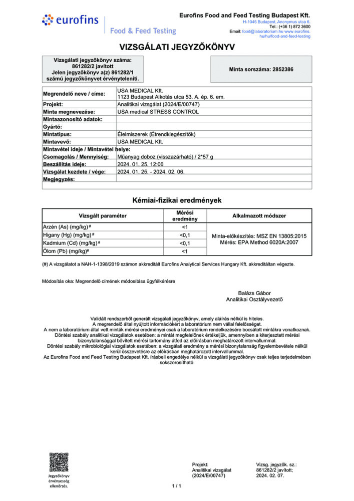 Ezeken kívül az USA medical Stress Control tartalmaz egy egyedi növényi kivonat keveréket, ami Ashwagandha gyökér kivonatból (Withania Somnifera), Citromfű kivonatból (Cymbopogon Citratus), Golgotavirág kivonatból (Passiflora Incarnata), Komló kivonatból (Humulus Lupulus), Bakopa monnieri kivonatból (Bacopa Monnieri), és Galagonya kivonatból (Crataegus) tevődik össze.