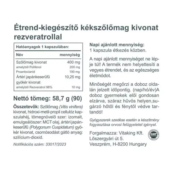 Hatóanyagok 1 kapszulában:Szőlőmag kivonat 400 mg