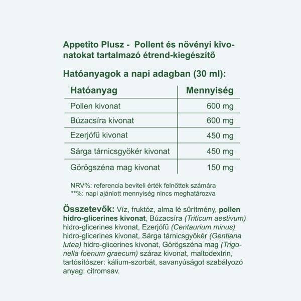 Összetevők: Víz, fruktóz, alma lé sűrítmény, pollen hidro-glicerines kivonat, Búzacsíra hidro-glicerines kivonat (Triticum aestivum), Ezerjófű hidro-glicerines kivonat (Centaurium minus), Sárga tárnicsgyökér hidro-glicerines kivonat (Gentiana lutea), Görögszéna mag száraz kivonat (Trigonella foenum graecum), maltodextrin, tartósítószer: kálium-szorbát, savanyúságot szabályozó anyag: citromsav.