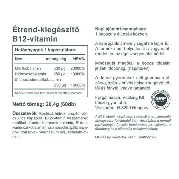 B-12 vitamin természetben előforduló összetevőkkel. Termékünk 500µg metilkobalamint 250mg hidroxokobalamint és 250mg adenozilkobalamint tartalmaz kapszulánként. (a B12 természetben előforduló formái) A B12 vitamin részt vesz a normál energiatermelő anyagcsere-folyamatokban, hozzájárul az idegrendszer normál működéséhez, a normál vörösvérsejt-képződéshez és az immunrendszer normál működéséhez.