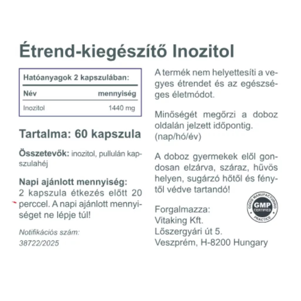 A Vitaking Inozitol kapszula 100% myo-inozitolt tartalmaz – tisztán, adalékanyagok nélkül, növényi kapszulahéjban. Ez egy természetes vegyület, amelyet sokszor B8-vitaminként említenek, noha valójában nem tartozik a vitaminok közé. Számos fontos élettani folyamatban vesz részt, és bár a szervezet is képes előállítani bizonyos mennyiségben, étrend-kiegészítők formájában is célszerű lehet alkalmazni bizonyos esetekben.