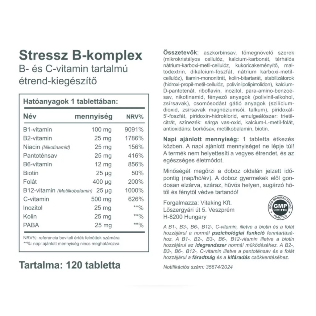 Ezen termékünk tartalmazza a B-vitamin komplex összes tagját, ezen kívül plusz B-1 vitamint és 500 mg C-vitamit is. Egyes B-vitaminok szedése mellett célszerű folyamatosan pótolni a C-vitamint is a szervezetben. Ez a termék speciálisan úgy készült el, hogy már eleve tartalmazza a napi szükséges mennyiségű C-vitamint.