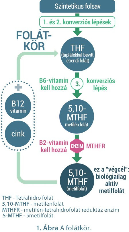 Az étrendi folát felszívódása a bélrendszerben majdnem 100%-os, tehát nem ez okozza a problémát, hanem az aktív molekulaformává (metilfolát) történő konverzió, amit a szervezetünknek kell(ene) elvégeznie. A folsav / étrendi folát a szervezetben biológiailag aktív metilfoláttá kell(ene) hogy konvertálódjon (1. ábra). Azért van a „kell” feltételes módban is, mert a már említett MTHFR génmutáció miatt ez a konverzió gyenge vagy nagyon gyenge hatásfokkal megy végbe.