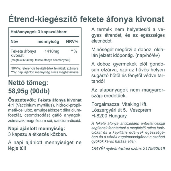 Fekete áfonya gyümölcs porítva (Vaccinium myrtillus) (6,6 mg antocianin) |