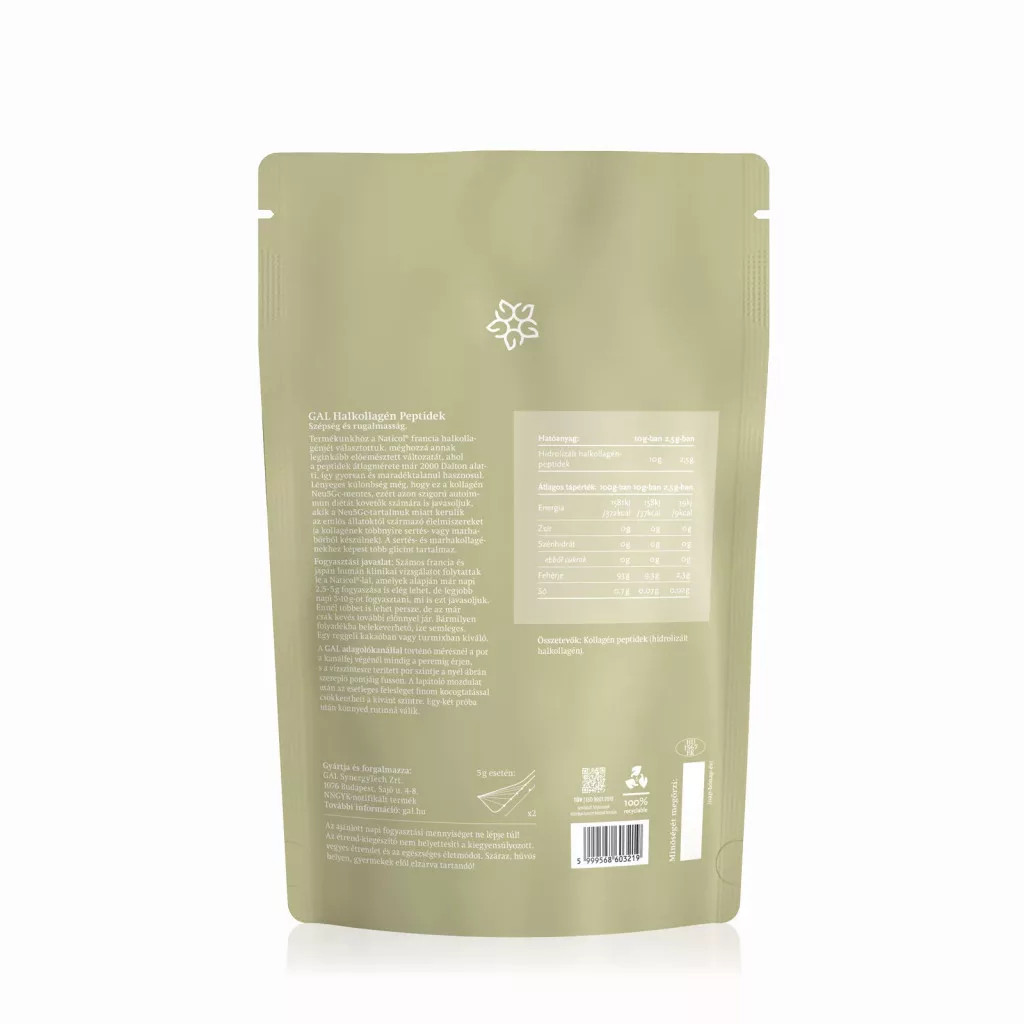 Termékünkhöz a Naticol® francia halkollagénjét választottuk, méghozzá annak leginkább előemésztett változatát, ahol a peptidek átlag mérete már 2000 Dalton alatti, így gyorsan és maradéktalanul hasznosul. Lényeges különbség még, hogy ez a kollagén Neu5Gc-mentes, ezért azon szigorú autoimmun diétát követők számára is javasoljuk, akik a Neu5Gc tartalmuk miatt kerülik az emlős állatoktól származó élelmiszereket (a kollagének többnyire sertés vagy marhabőrből készülnek). A sertés és marhakollagénekhez képest több glicint tartalmaz.