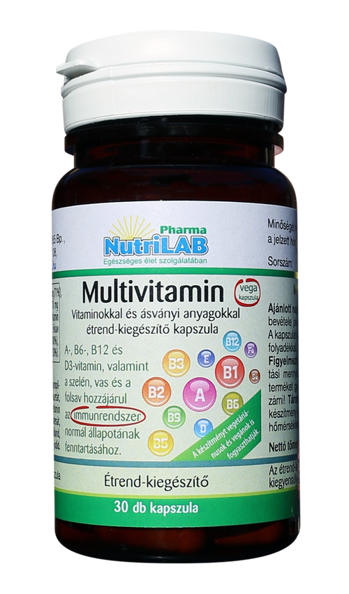 A NutriLAB Multivitamin vitamin és ásványi anyagokat tartalmazó kapszulát ajánlott tetszőleges mennyiségű folyadékkal, étkezések között bevenni.