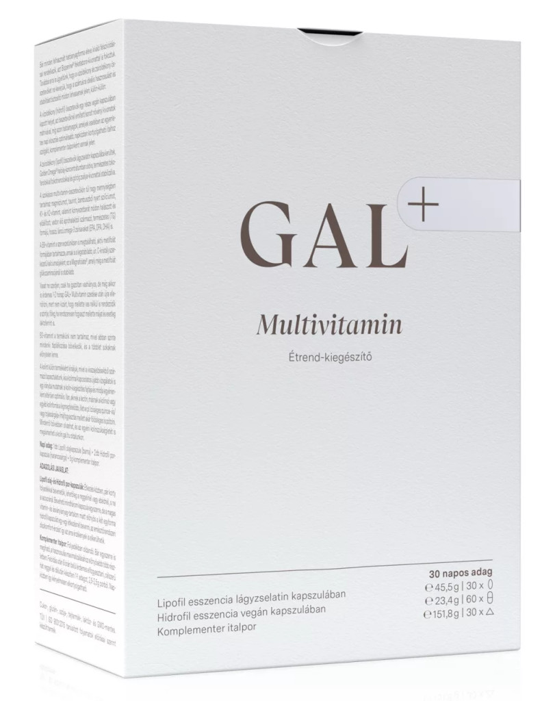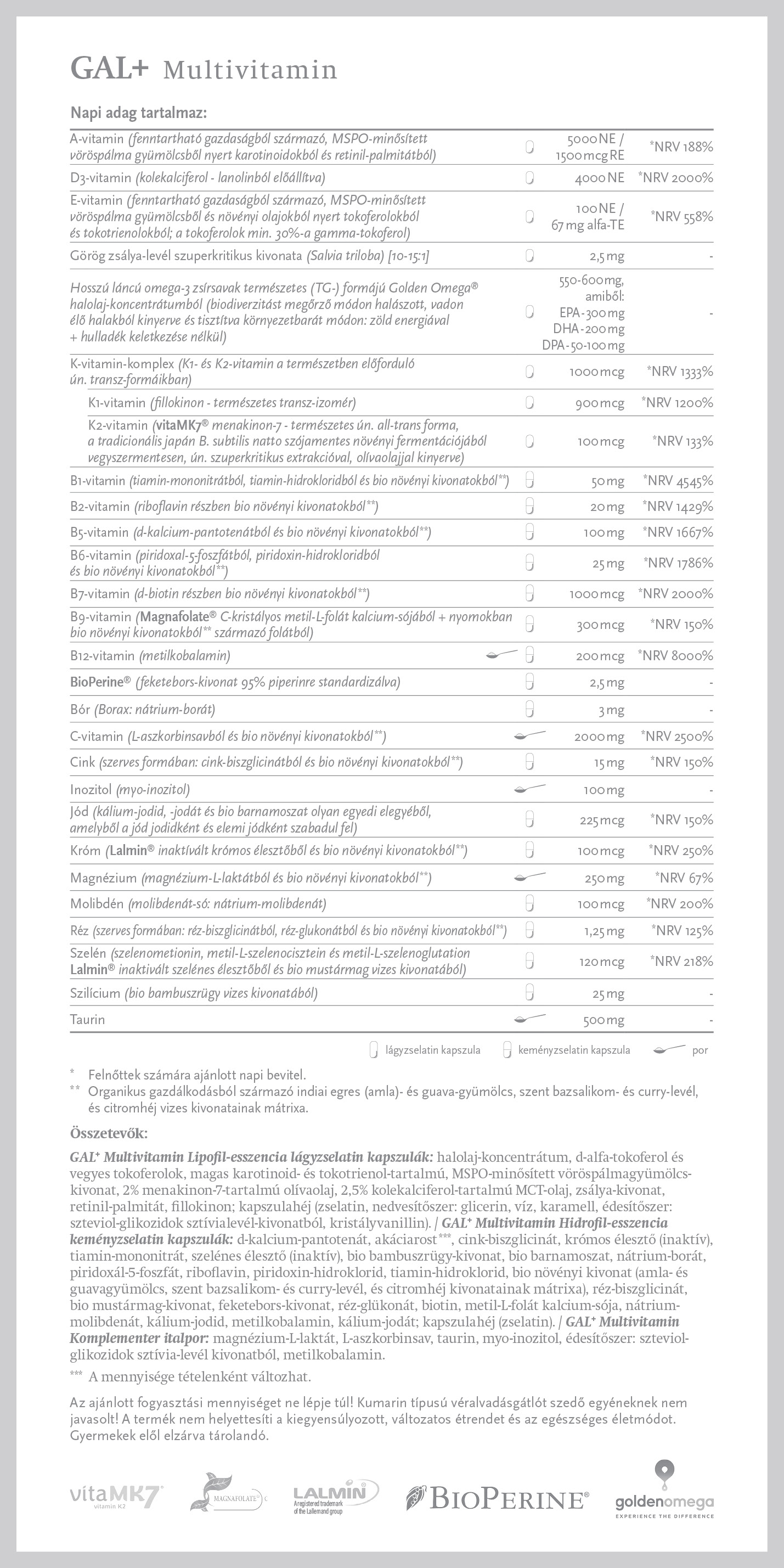 A GAL+ Multivitamin termékünket a legújabb kutatások fényében fejlesztettük ki, szem előtt tartva a természetességet és életszerűséget, hogy minden vitamint, ásványianyagot, nyomelemet ideális formában, mennyiségben és arányban tartalmazzon, nem eltérve attól, ahogyan ezekhez állandó tápanyagdús, változatos táplálkozással juthatnánk. Ahol előnyös, a vitaminok és ásványok részben organikus termesztésből származó (bio) gyógy- és fűszernövények kivonatából származnak. A mennyiségek esetében végig fontosnak tartottuk, hogy a napi adag biztosan tartalmazza a hatásosnak talált dózist, de semmi esetre se lépje túl az életszerű mennyiségeket, azaz azt a mennyiséget, amit táplálkozással már nem is lehetne fedezni sehogyan sem. Emellett rendkívül fontos, hogy a gondosan válogatott alapanyagok mellett ne lábatlankodjék semmi, ami nem odavaló. A termékünkben ilyesminek nyomát sem találja.